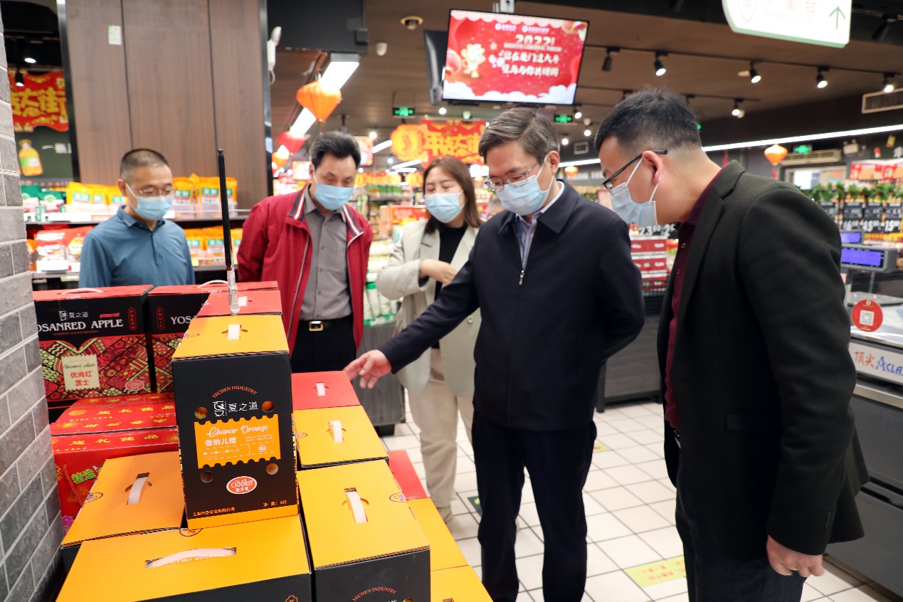 2022年1月26日,夏商集团党委副书记、总经理文杰带队,对集团旗下春节前市场供应工作开展调研检查,先后到夏商配送中心、夏商民兴超市美仁店和官任店,现场查看蔬菜水果、肉禽蛋奶、米面粮油等主要农副产品供应情况,并向一线职工致以新春祝福。