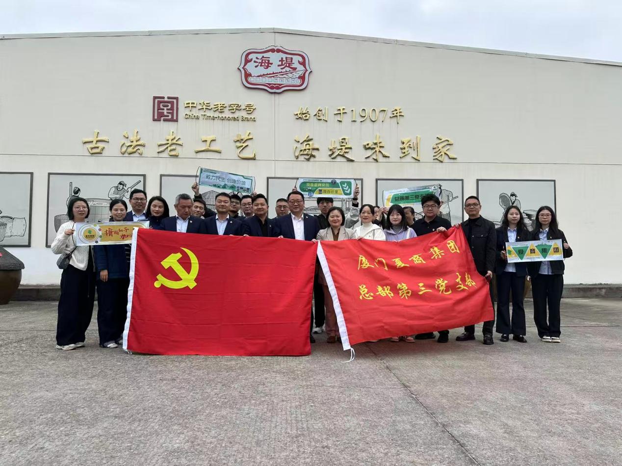 全体人员首站前往夏商淘化大同产业园参观学习。在厂区工作人员引导下,党员们实地走访传统晒场、酿造车间及现代化生产线,深入了解夏商酱油"百年传承、匠心酿造"的品牌历史与工艺文化。